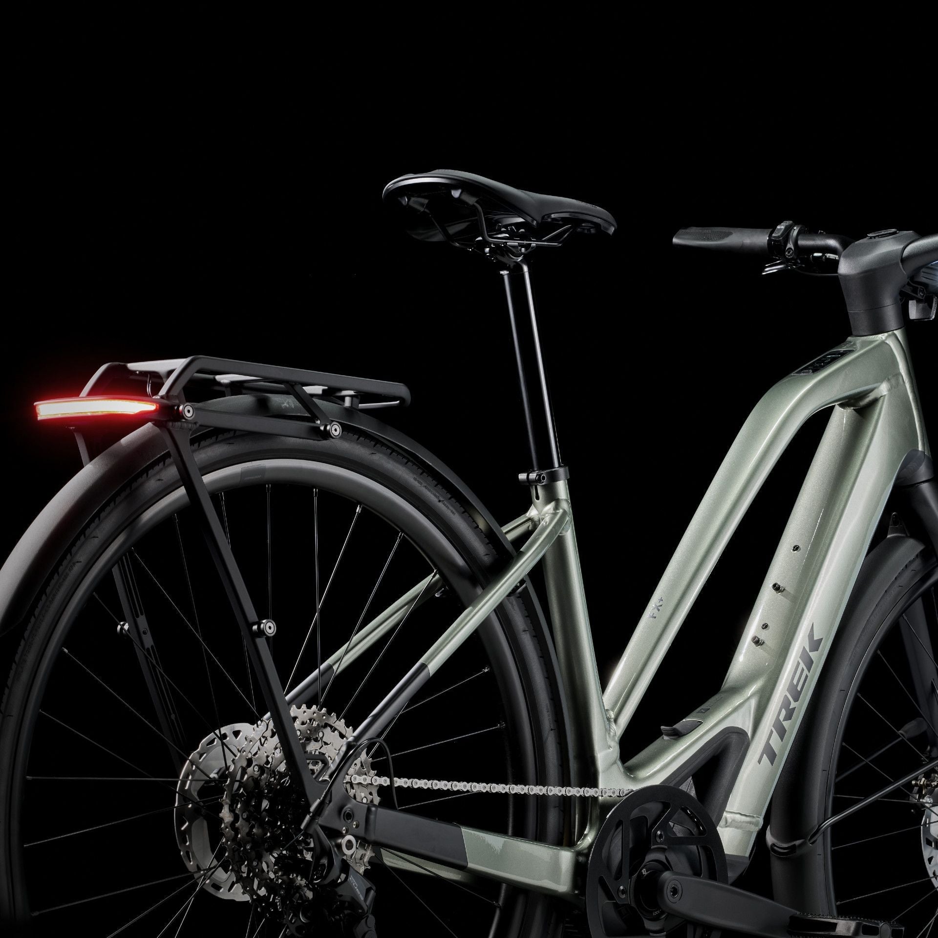 Alpha Platinum-alumiini, sisäiset vaijerireititykset, kiinteästi integroitu akku, kiinnityspisteet tavaratelineelle ja lokasuojille, post mount-levyjarrukiinnike